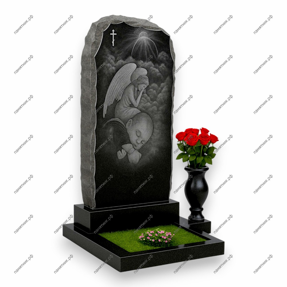Описание: Массивная вертикальная стела со скалистыми боковыми гранями. На лицевой полированной стороне выполнена детальная художественная гравировка: ангел, сидящий на облаках и оберегающий сон младенца. В верхнем левом углу выгравирован крест, а по центру — пробивающиеся лучи света.
