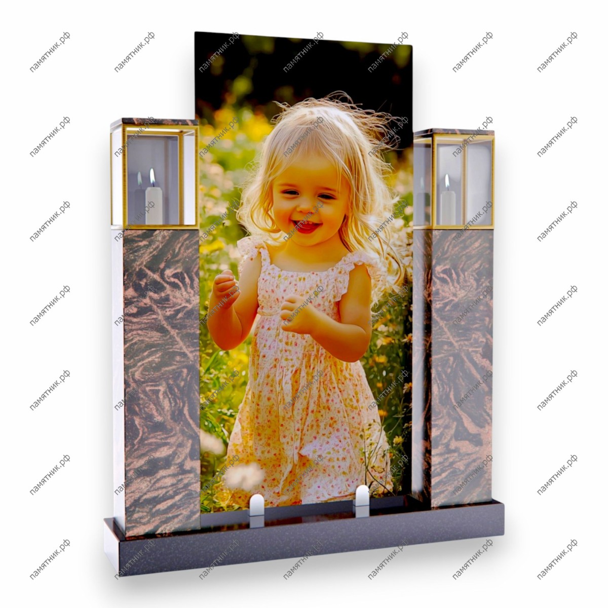 Особенности: Стеклянная панель надежно закреплена между двумя красивыми каменными пилонами. Вершина каждого пилона оформлена в виде стеклянного фонаря-лампады со свечами внутри. Этот мемориал выглядит невероятно живым, наполненным светом и любовью.
