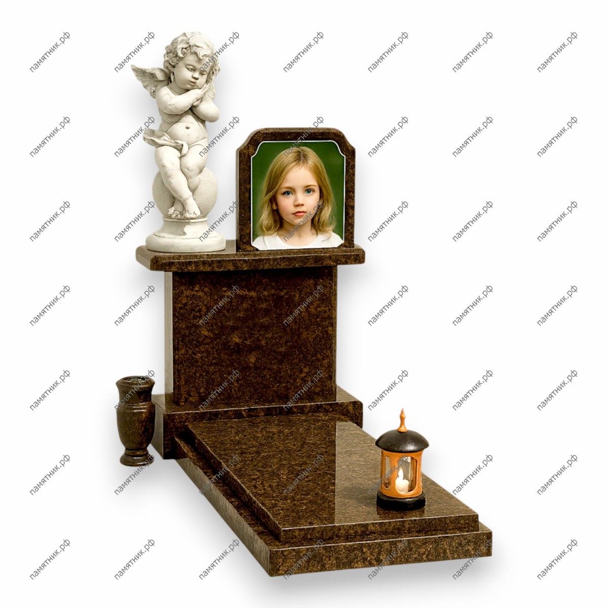 Описание: Нестандартная архитектурная композиция. Стела представляет собой небольшую плиту с арочным верхом, внутри которой находится цветной портрет девочки в светлой окантовке. Стела установлена на массивный гранитный постамент, а слева от нее, на выступе постамента, располагается белая статуя ангела, опирающегося на сферу.