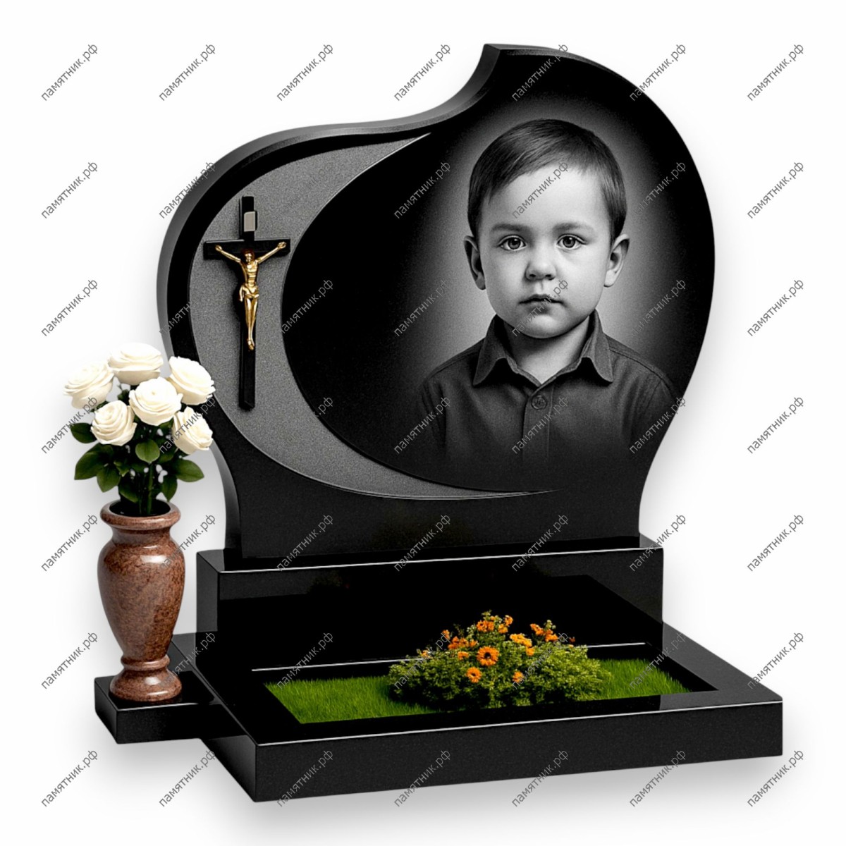 Описание: Лаконичная стела в форме широкого асимметричного сердца (или капли). Правую часть занимает крупный черно-белый портрет мальчика. Слева вырезан глубокий полумесяц, в центре которого закреплено бронзовое распятие.