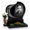 Особенности: Основание представляет собой строгий прямоугольный постамент с открытым цветником, где на зеленой траве высажены яркие оранжевые цветы. На специальном выступе основания слева стоит ваза из коричневого гранита с букетом белых роз.