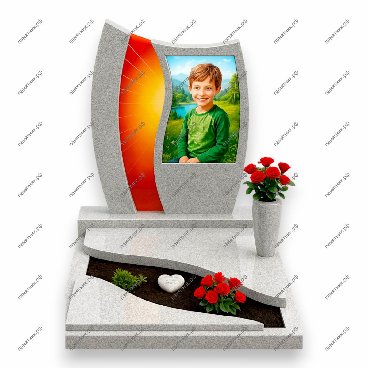 Описание: Современный, светлый и жизнеутверждающий мемориал. Стела имеет плавные изогнутые формы. Справа расположен крупный цветной портрет улыбающегося мальчика, а слева встроена яркая вертикальная вставка (стекло или акрил), символизирующая лучи солнца (переход от красного к желтому).