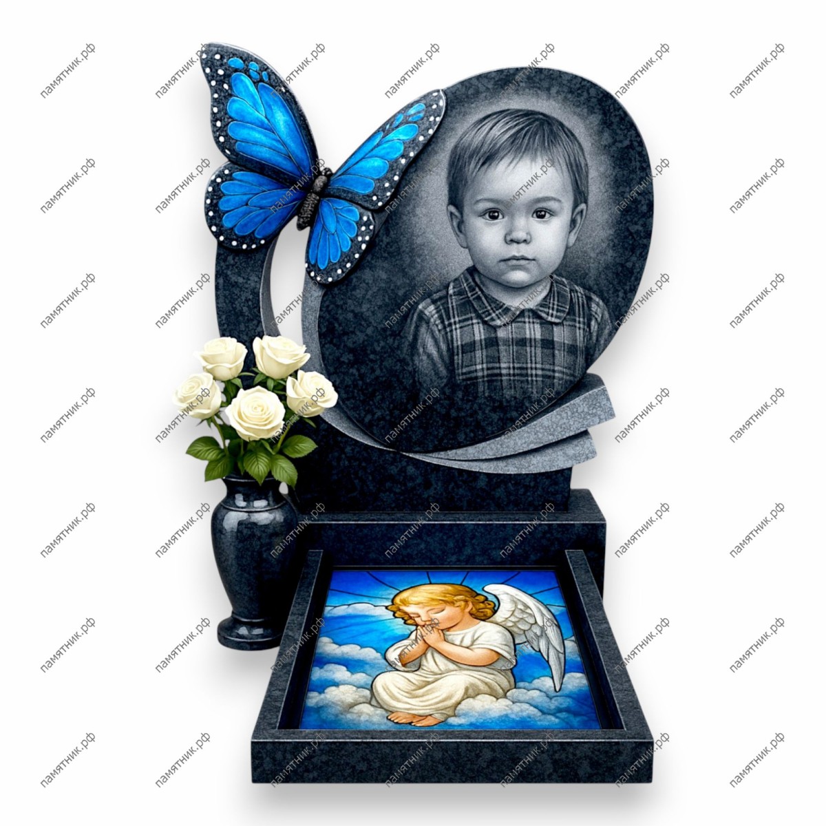 Особенности: Основание состоит из строгой темной рамки. Вместо традиционного цветника в раму встроена яркая полноцветная картина (стилизованная под витраж или эмаль) с изображением молящегося ангела на облаках. Слева от стелы установлена фигурная ваза в тон памятнику с букетом белых роз.
