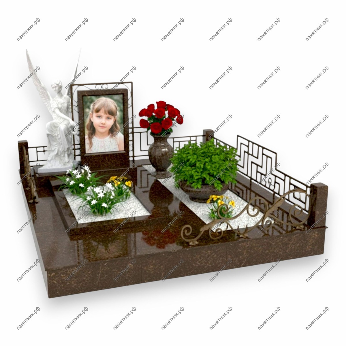 Особенности: Широкое основание из коричневого гранита ограждено по периметру красивой декоративной металлической оградой с коваными элементами. На надгробной плите обустроены две прямоугольные ниши, засыпанные белой крошкой, с высаженными в них цветами. В центре стоит гранитная ваза с красными розами, а справа — большая чаша с пышным зеленым растением.