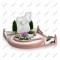 Особенности: Основание имеет сложную округлую форму с многоуровневыми террасами и изящными гранитными оградками. Ландшафтный дизайн включает в себя зеленые туи на заднем фоне, центральную клумбу с белыми и фиолетовыми цветами, вымощенные светлой плиткой дорожки и декоративную пирамидку из камней (каирн) на надгробной плите. Композиция символизирует спокойствие и гармонию.