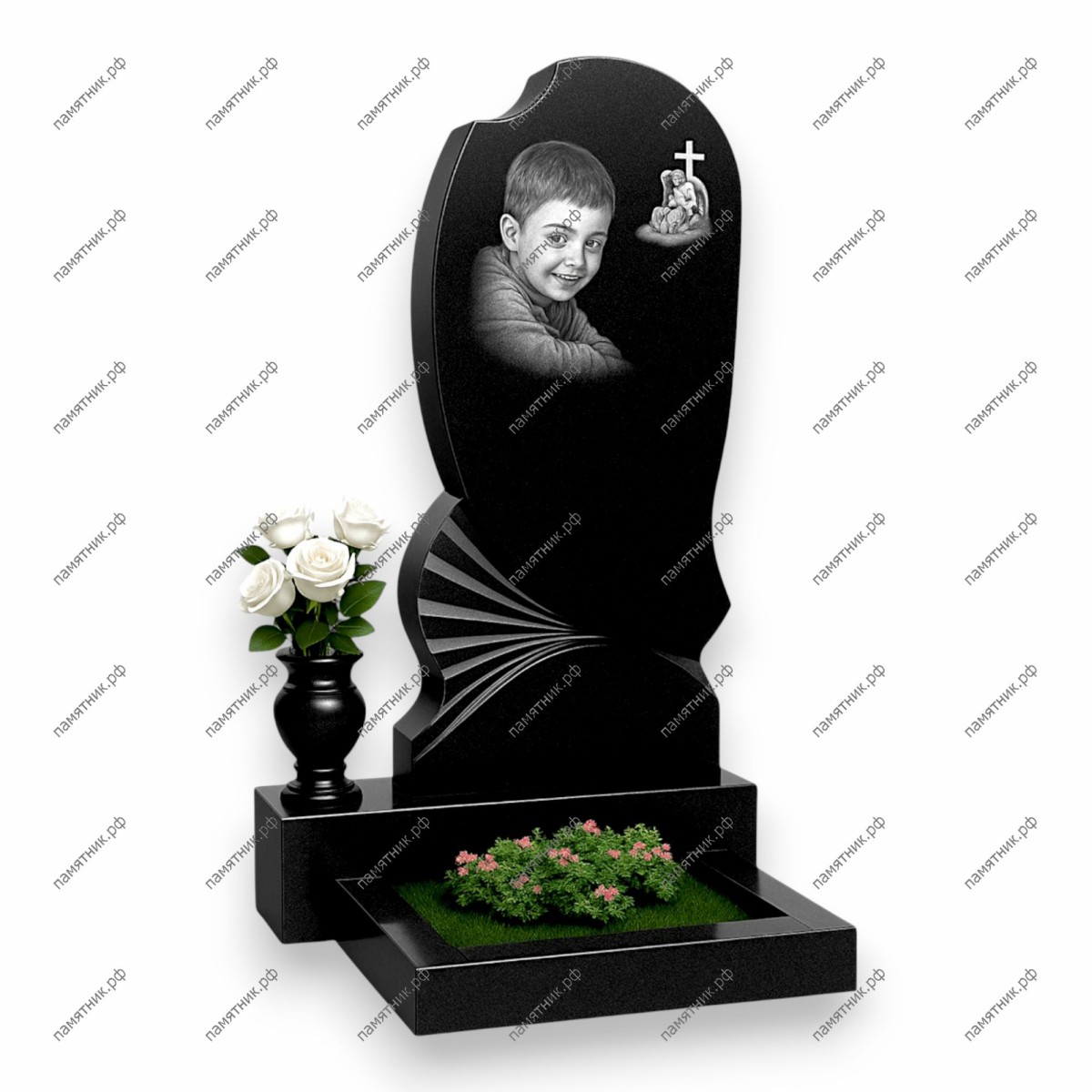 Описание: Вертикальная стела сложной формы с асимметричным волнообразным краем. В левой нижней части вырезан декоративный рельеф в виде раскрытого веера или лучей. На стеле размещен крупный черно-белый портрет улыбающегося мальчика, а в правом верхнем углу — небольшая гравировка креста с сидящим под ним скорбящим ангелом.
