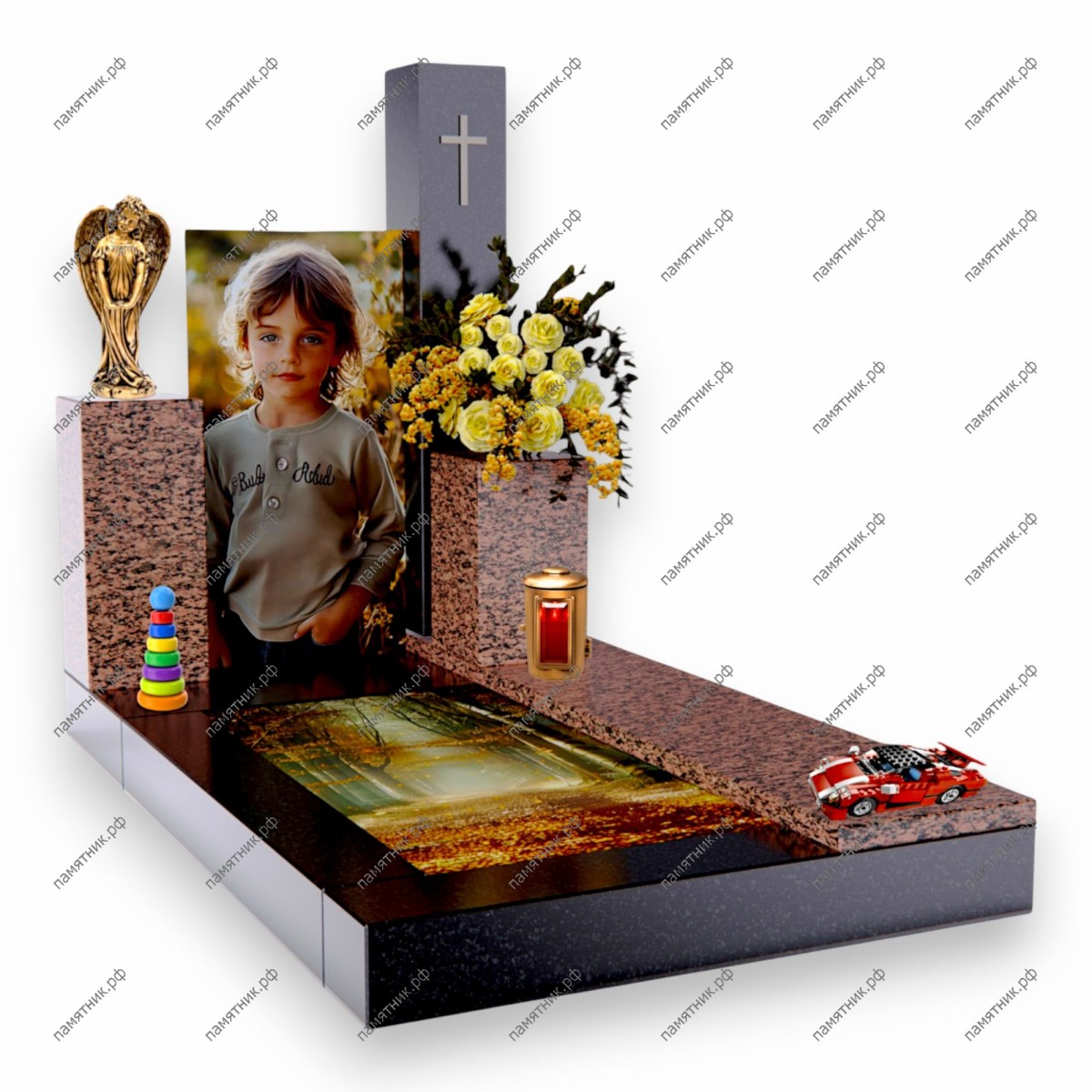 Особенности: Настоящим произведением искусства является надгробная плита — в нее интегрирована большая стеклянная (или керамическая) панель с ярким, светящимся изображением залитой солнцем осенней аллеи. Композиция украшена тематическими детскими элементами (пирамидка, красная машинка) и бронзовой лампадой.