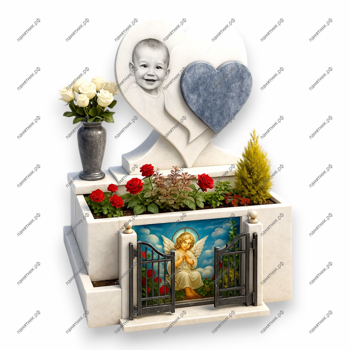 Особенности: Основание представляет собой уникальную многоярусную конструкцию из белого камня. Верхний ярус оформлен как открытая клумба с красными розами и миниатюрной туей. В нижний ярус встроена цветная картина с изображением ангела на фоне неба, закрытая декоративными коваными металлическими воротами. Слева на уступе стоит темная гранитная ваза с белыми розами.