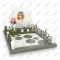 Особенности: Огромное прямоугольное основание выполнено из темного гранита. По периметру установлена изящная кованая ограда с гранитными столбиками. Внутренняя часть участка засыпана белой крошкой, по которой выложена декоративная дорожка из круглых темных плит. В левом верхнем углу обустроен зеленый газон с розовыми цветами, светлая фигурная ваза с розовыми пионами и золотистая лампада.