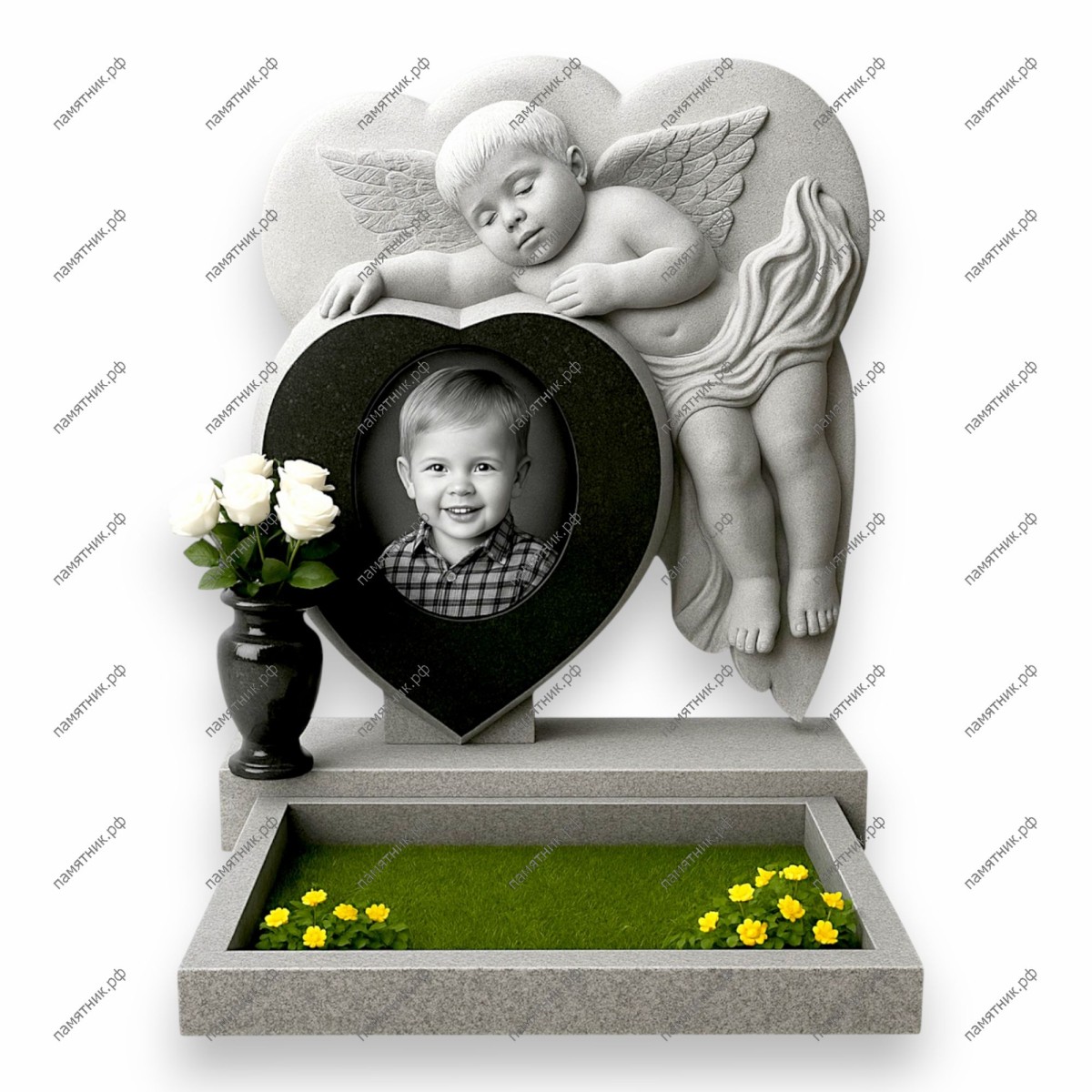 Описание: Высокохудожественный и трогательный памятник. Главный элемент — крупный объемный барельеф спящего маленького ангела из светлого камня, который облокотился на большое сердце из черного гранита. Внутри черного сердца расположен цветной портрет улыбающегося мальчика.
