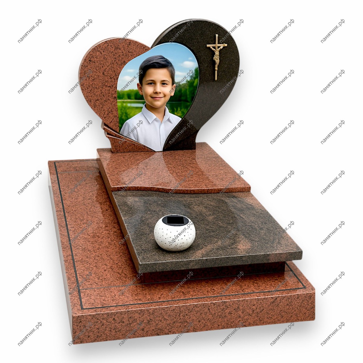 Описание: Стела в форме асимметричного сердца, искусно комбинирующая красный и черный камень. В центре расположена сердцевидная ниша с цветным портретом мальчика на фоне летнего пейзажа. В правой верхней части прикреплено бронзовое распятие.