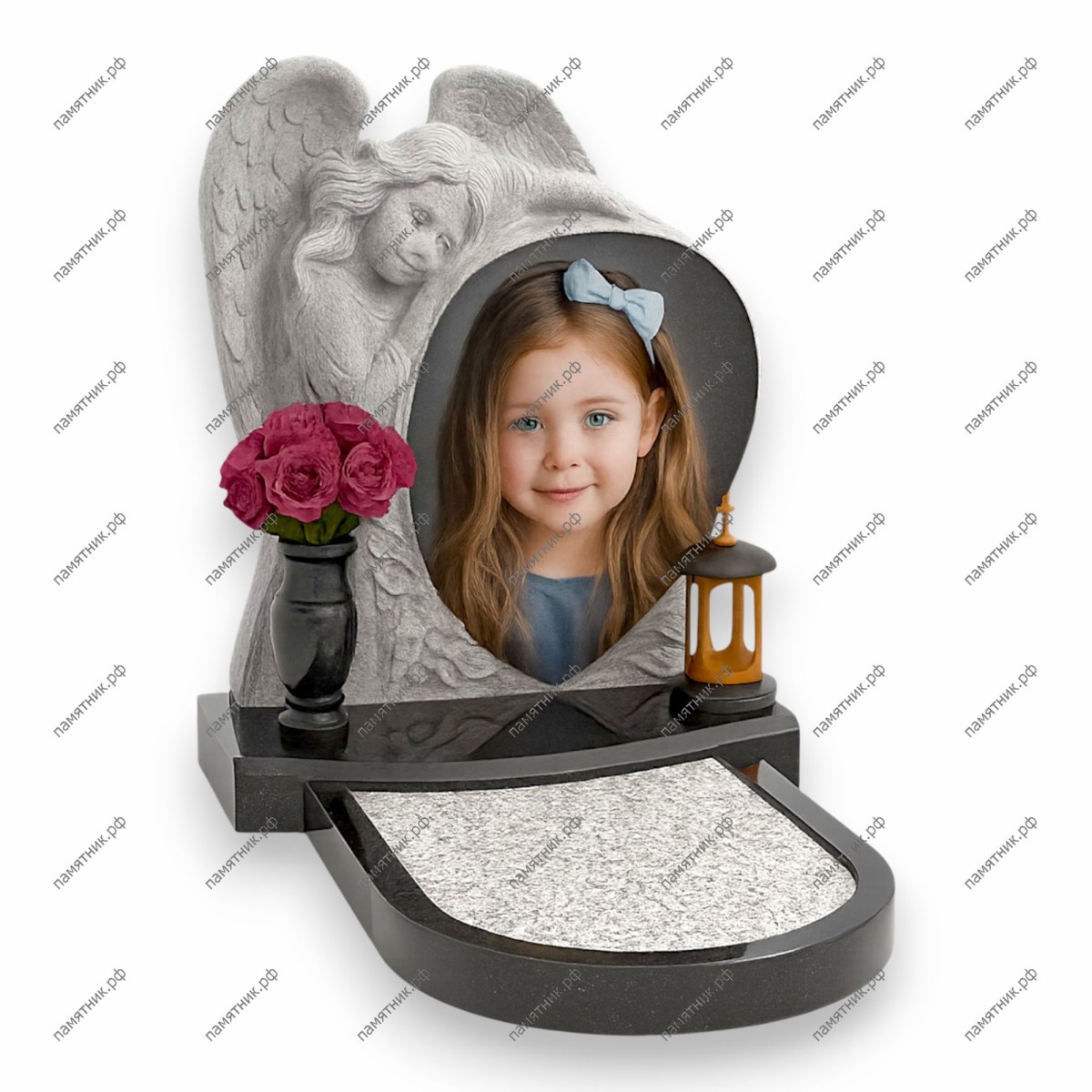 Описание: Объемная и очень выразительная скульптурная стела. Из серого камня вырезан барельеф скорбящего ангела, который словно оберегает крыльями и руками центральную часть композиции — черное гранитное сердце с крупным цветным портретом девочки с голубым бантом.