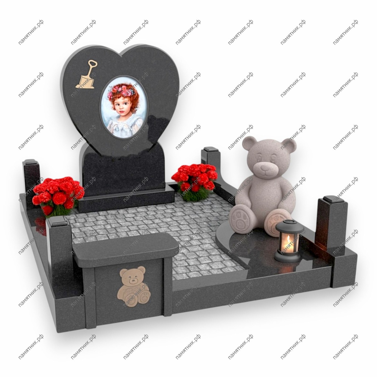 Теплота и нежность в строгом гранитею. Мемориал ПД-124 трогает до глубины души вниманием к детским деталям. Центральная стела из темного полированного гранита выполнена в форме идеального сердца, внутри которого размещен светлый портрет. Контрастным и очень трогательным элементом является объемная каменная скульптура плюшевого мишки, сидящего на надгробной плите. Ограда дополнена декоративными элементами с гравировкой игрушек, что делает этот комплекс глубоко личным.