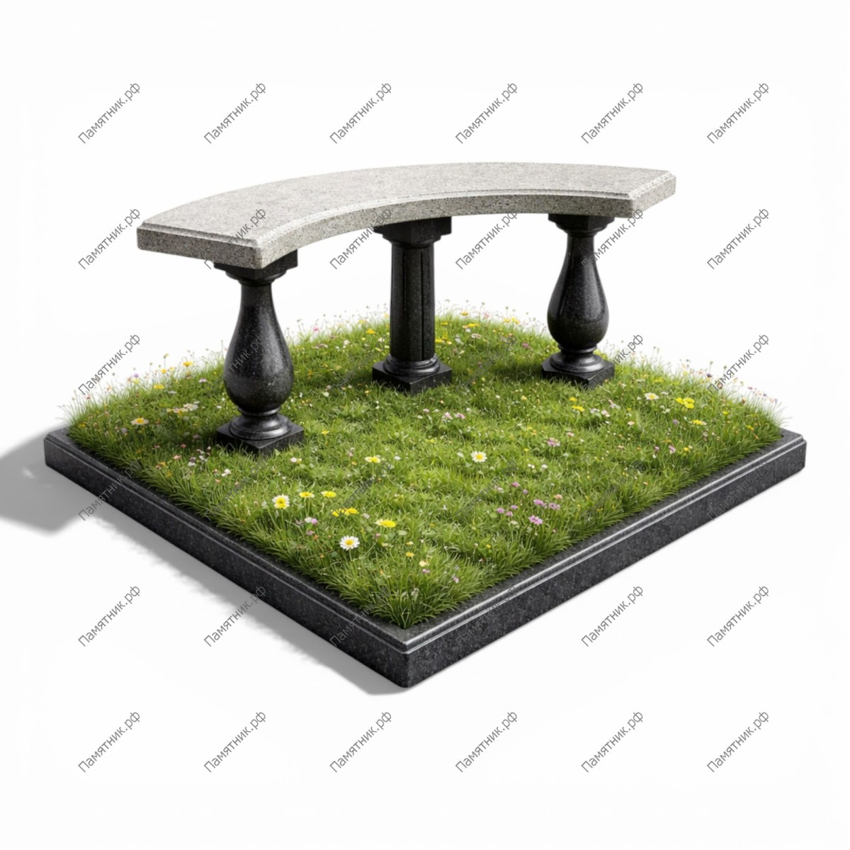 Удлиненная радиусная (полукруглая) лавочка премиум-класса на трех опорах. Просторная модель со светлым сиденьем, предназначенная для крупных мемориальных комплексов и семейных захоронений.