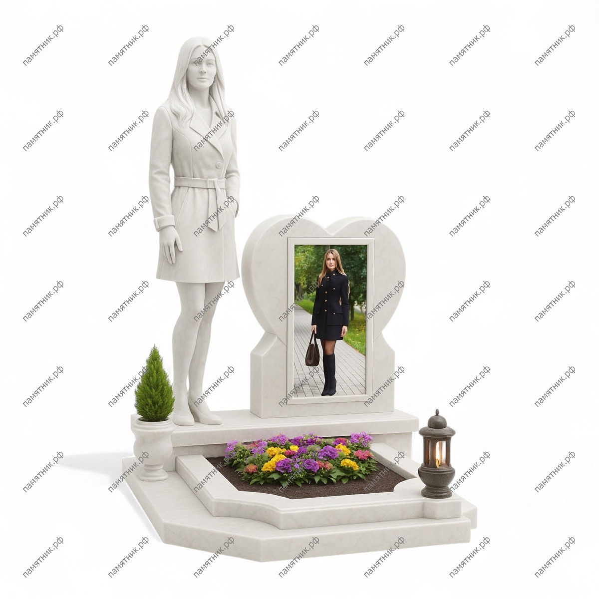 Мемориальный комплекс МК-103 — это невероятно светлый, личный и трогательный мемориал из белоснежного камня. Главной особенностью комплекса является портретная полноростовая скульптура усопшей, установленная рядом с изящной стелой в форме сердца. Композиция излучает любовь, чистоту и светлую память.