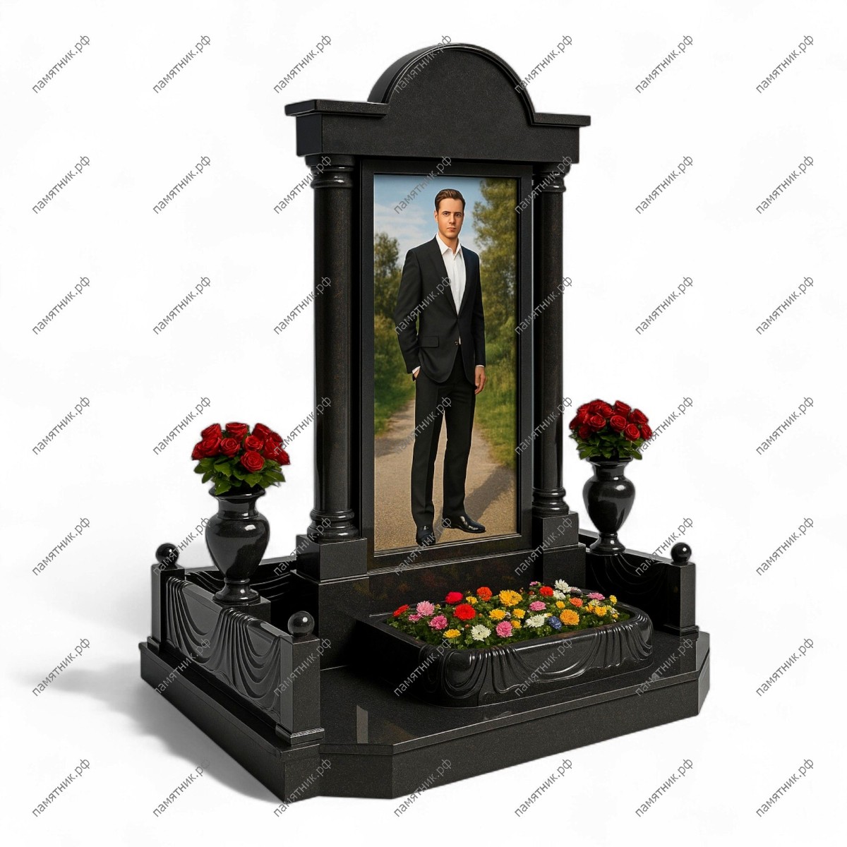 Мемориальный комплекс МК-11 — это величественный памятник из черного полированного гранита, выполненный в классическом архитектурном стиле. Центральная стела, предназначенная для размещения ростового портрета, обрамлена массивными круглыми колоннами и увенчана изящным фигурным карнизом.