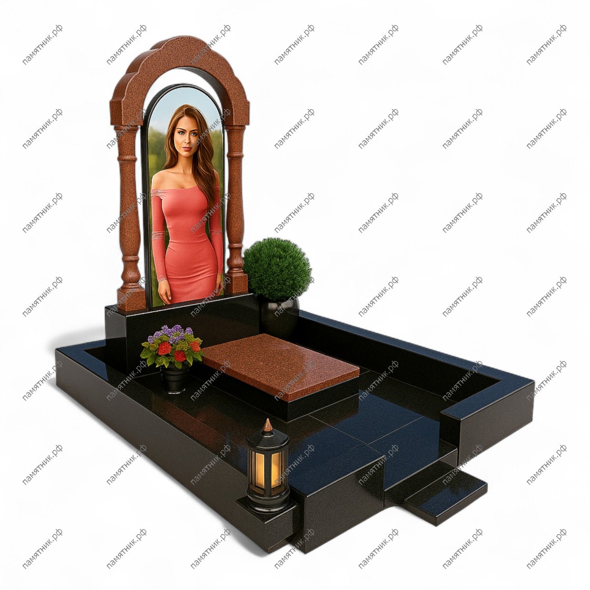 - Комплектация: Арочная стела с колоннами, полностью закрытая черная надгробная плита с накладным элементом из красного гранита, многоуровневый П-образный подиум со ступенями, каменный вазон-чаша и массивная лампада.