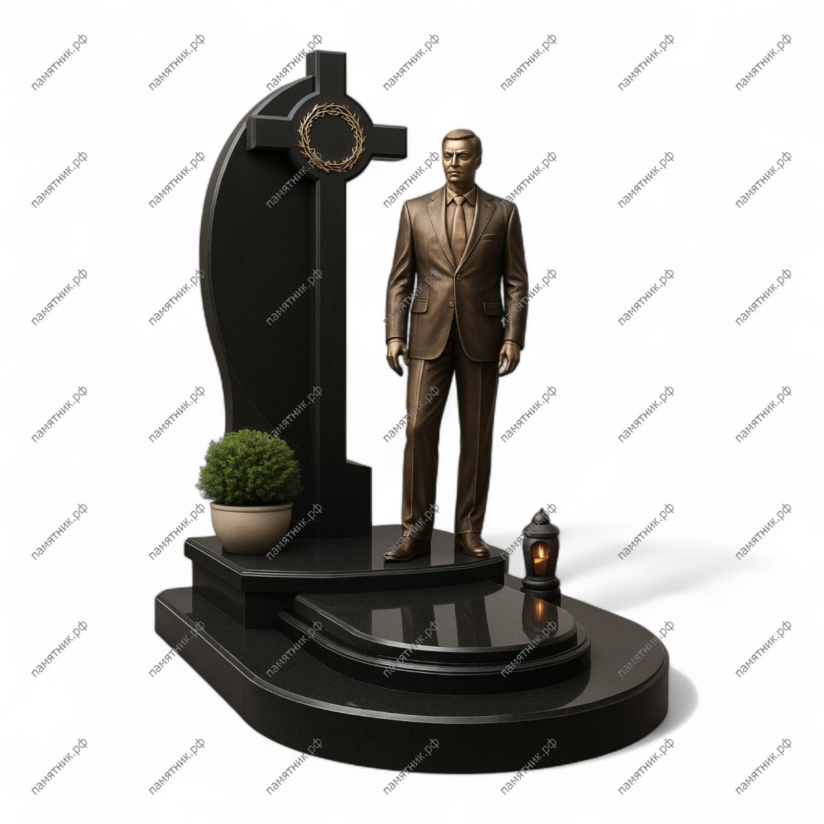 - Особенности: Индивидуальная полноростовая скульптура из бронзы, стела сложной формы с крестом и терновым венцом, закругленная геометрия основания.