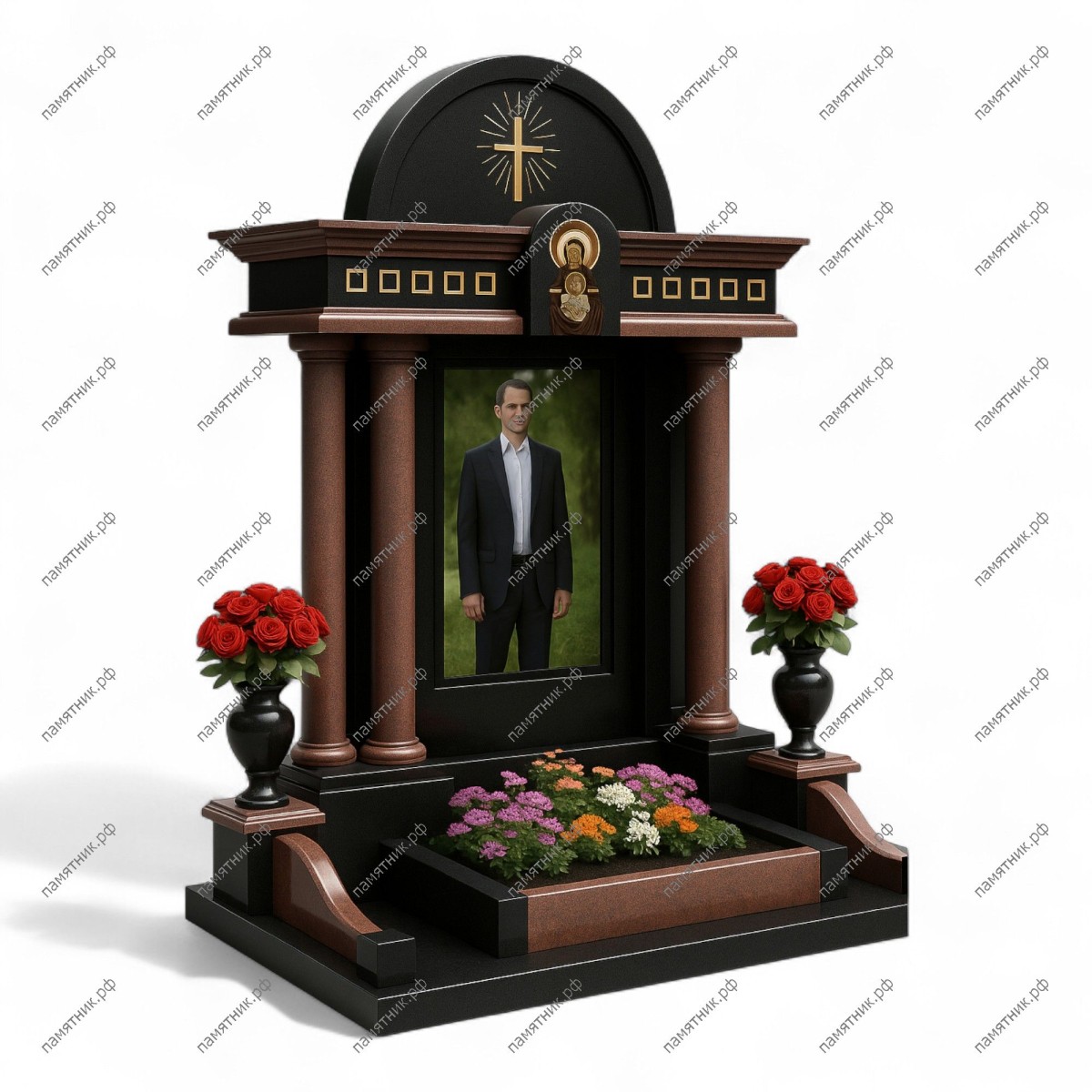 Мемориальный комплекс МК-12 привлекает внимание благородным контрастным сочетанием черного и красно-коричневого гранита. Массивные колонны поддерживают строгий многоуровневый свод, украшенный золотым крестом и барельефом с ликом святого.