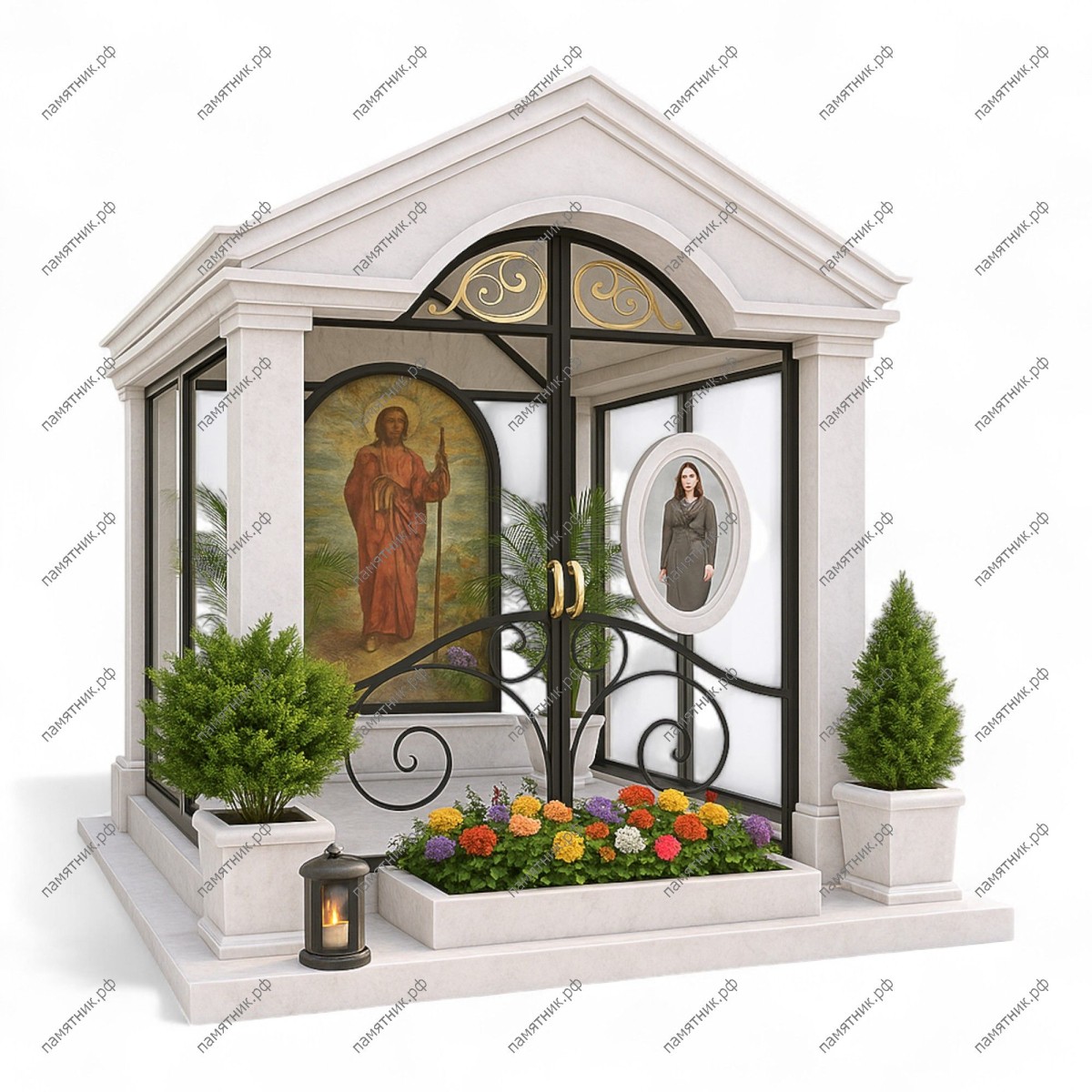 - Комплектация: Здание часовни, кованые и стеклянные элементы ограждения, ростовое панно внутри, отдельный портретный элемент, открытый П-образный цветник перед входом, ступенчатый цоколь, вазоны и кованый фонарь-лампада.