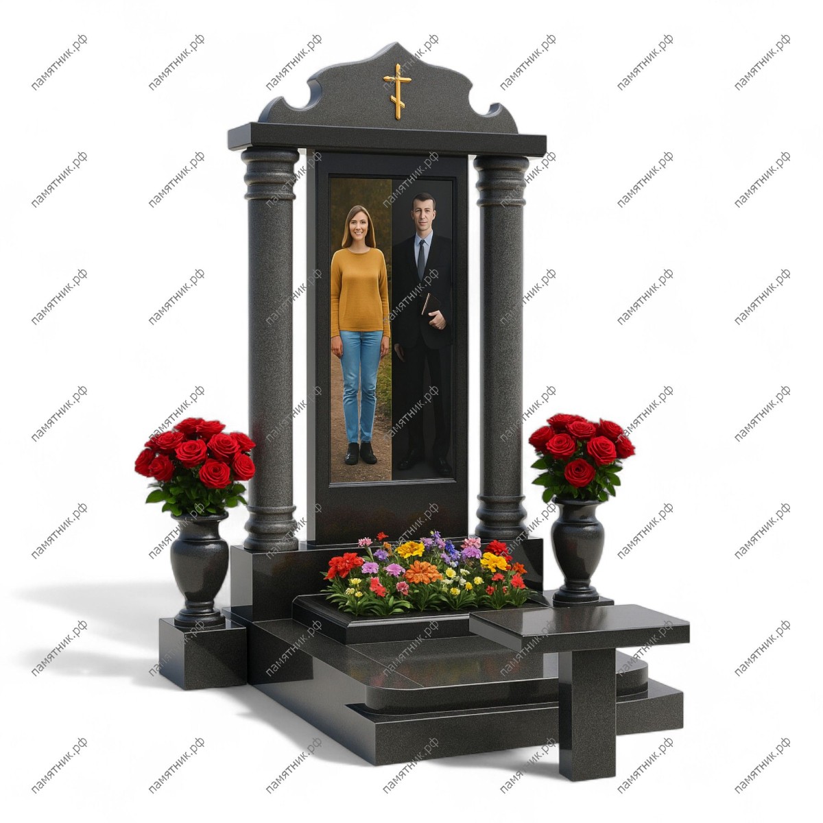 Мемориальный комплекс МК-13 из темного гранита воплощает в себе вечную классику и монументальность. Широкая арочная стела с золотым крестом гармонично поддерживается двумя солидными колоннами. Ширина памятника позволяет комфортно разместить двойной семейный портрет в полный рост.