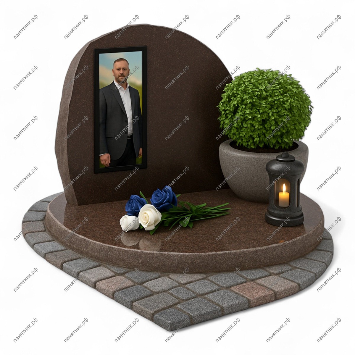 Мемориальный комплекс МК-131 — это лаконичное и природное решение, выполненное из коричневого гранита. Асимметричная стела со скругленными, грубо обработанными краями, имитирующая природную скалу, дополнена строгой прямоугольной нишей для портрета. Основание имеет каплевидную форму и по периметру обрамлено декоративной брусчаткой.