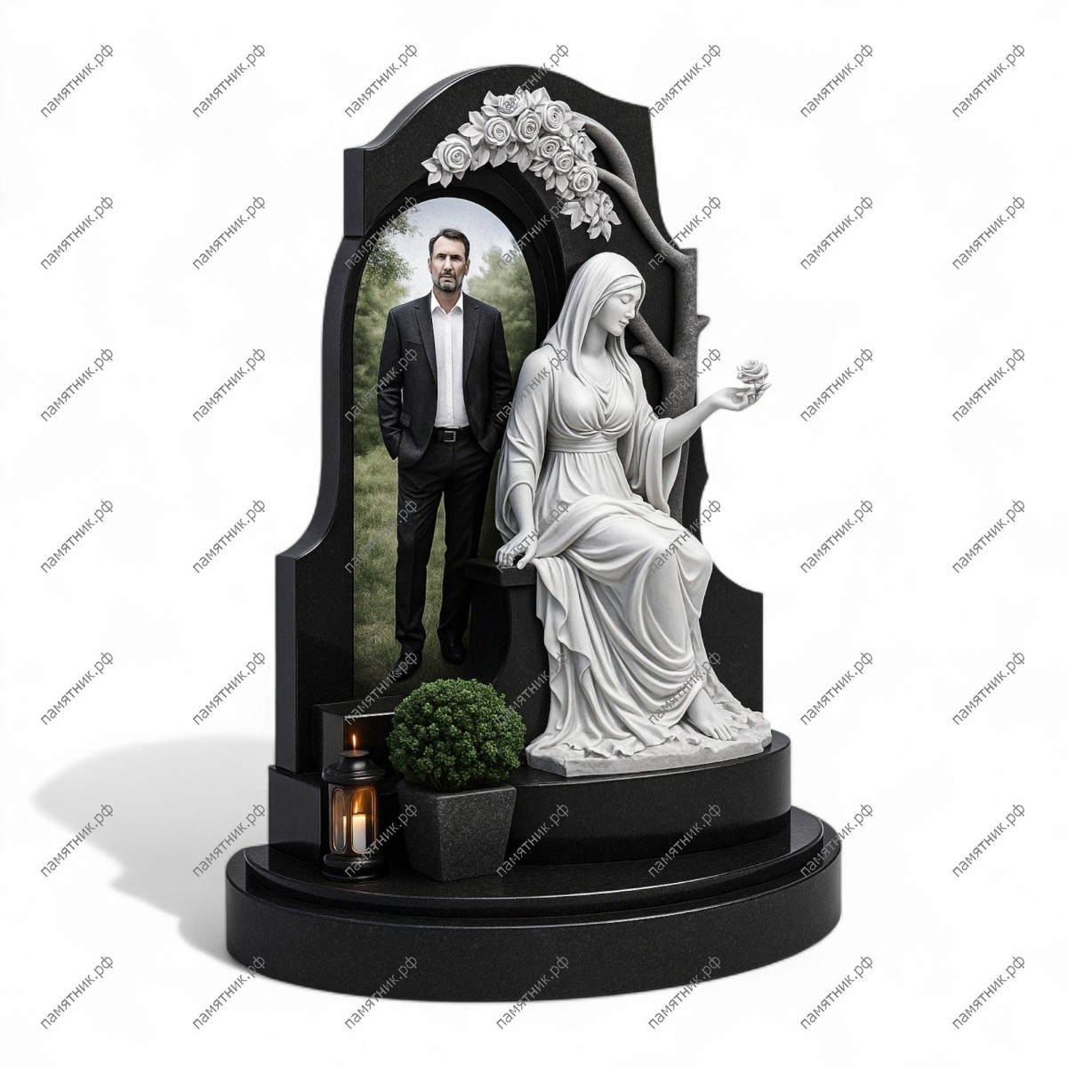Мемориальный комплекс МК-135 — это высокохудожественная композиция из черного гранита и белого мрамора. На фоне строгой асимметричной стелы располагается крупная детализированная скульптура скорбящей девы и объемная резная ветвь с розами, нависающая над нишей для портрета.