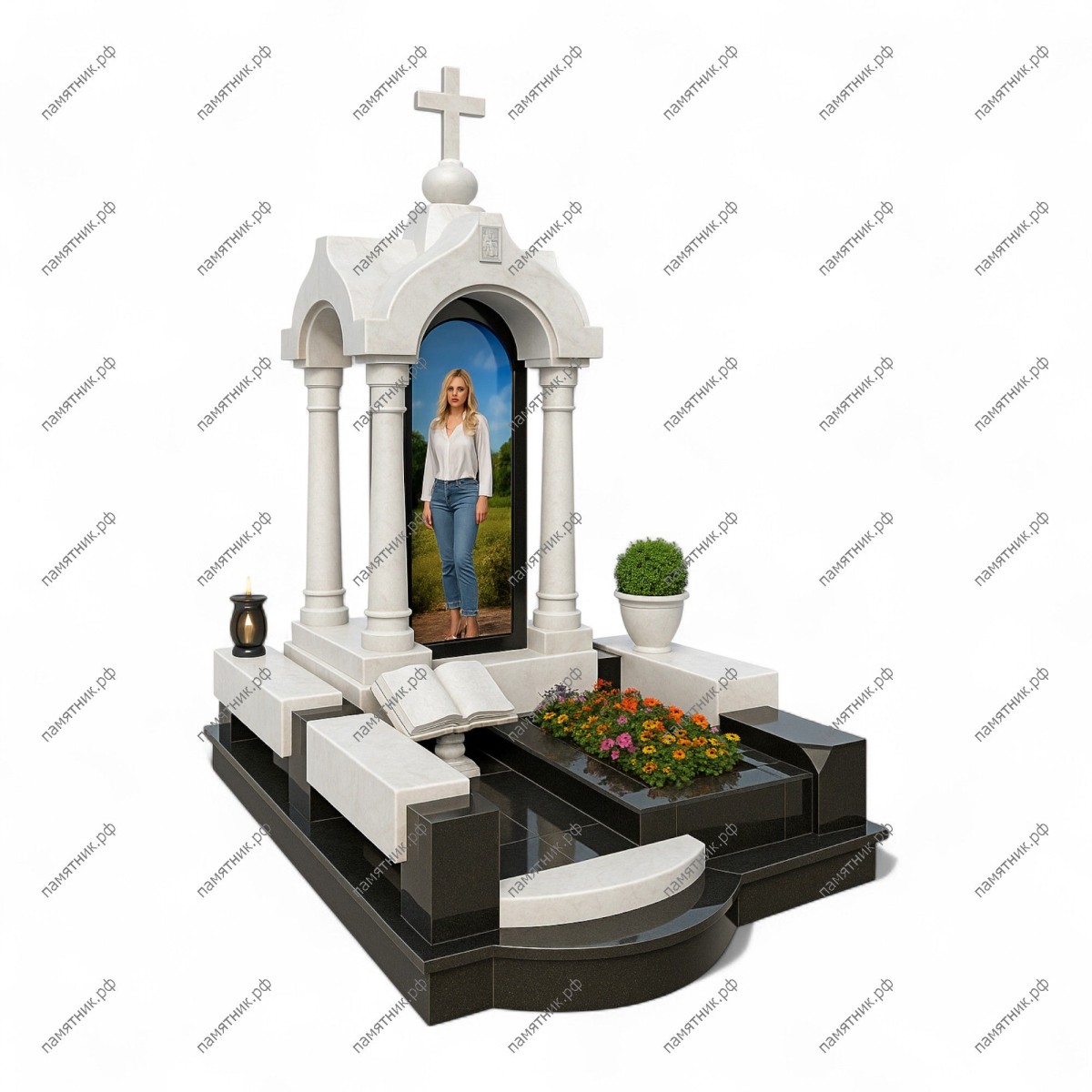 Мемориальный комплекс МК-136 — это грандиозная открытая часовня-сень из белого камня на контрастном черном основании. Четыре строгие колонны поддерживают массивный купольный свод с крестом, внутри которого располагается черная стела с портретом. Перед часовней на фигурной тумбе установлена скульптура в виде раскрытой книги.