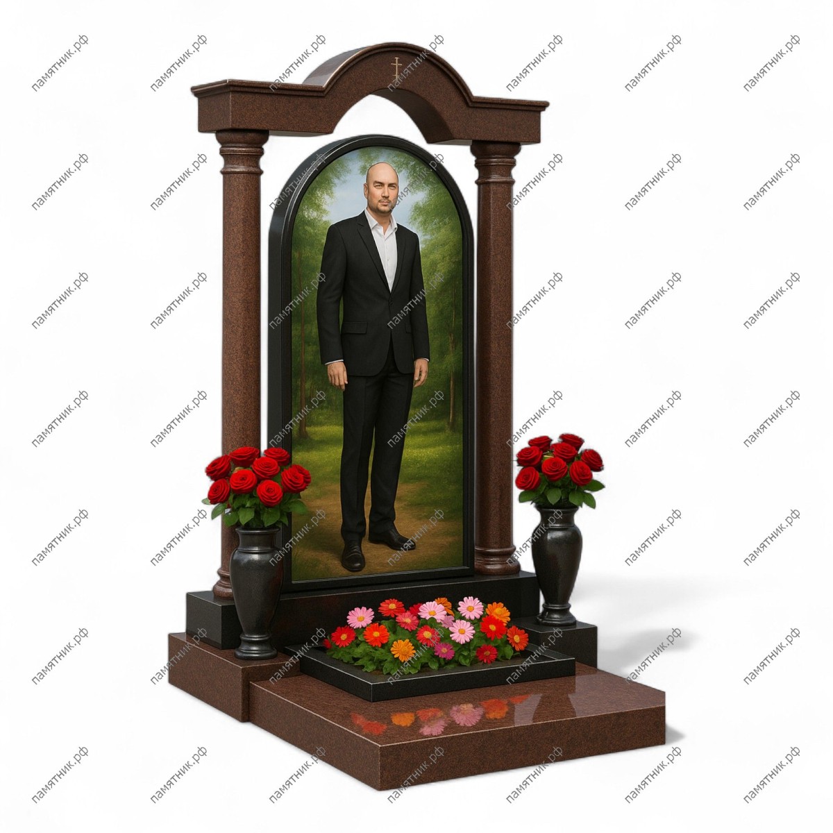 Мемориальный комплекс МК-14 выполнен из красивого красно-коричневого гранита с контрастной черной вставкой, которая служит идеальным фоном для гравировки или фотокерамики. Изящная арка, увенчанная крестом, и классические колонны создают светлый и возвышенный архитектурный ансамбль.