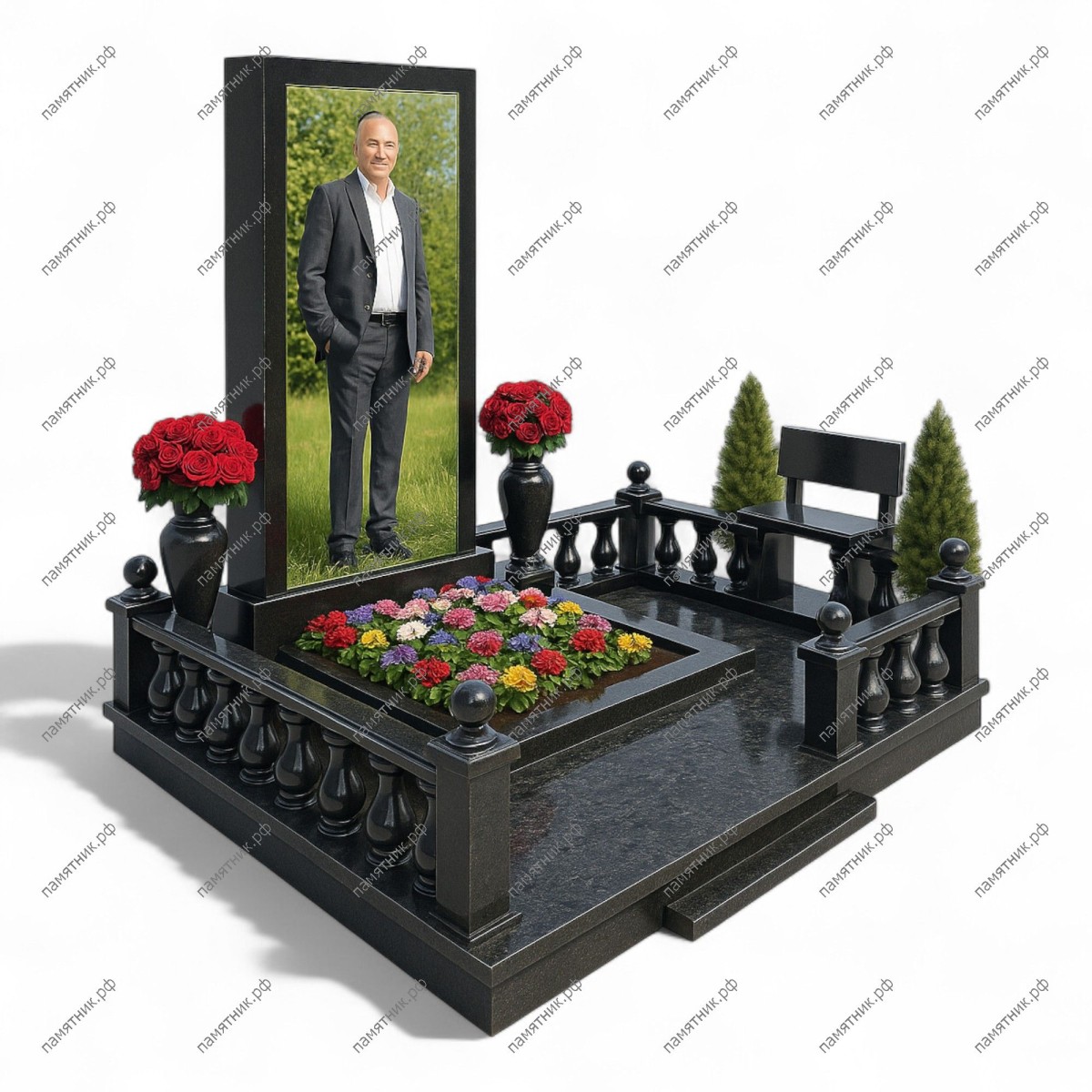 Мемориальный комплекс МК-141 — это строгий и респектабельный ансамбль, полностью выполненный из черного гранита. Высокая прямоугольная стела предназначена для размещения ростового портрета. Просторное место захоронения обрамлено классической оградой с фигурными балясинами и круглыми шарами на столбиках, а в углу предусмотрена лаконичная гранитная скамья.