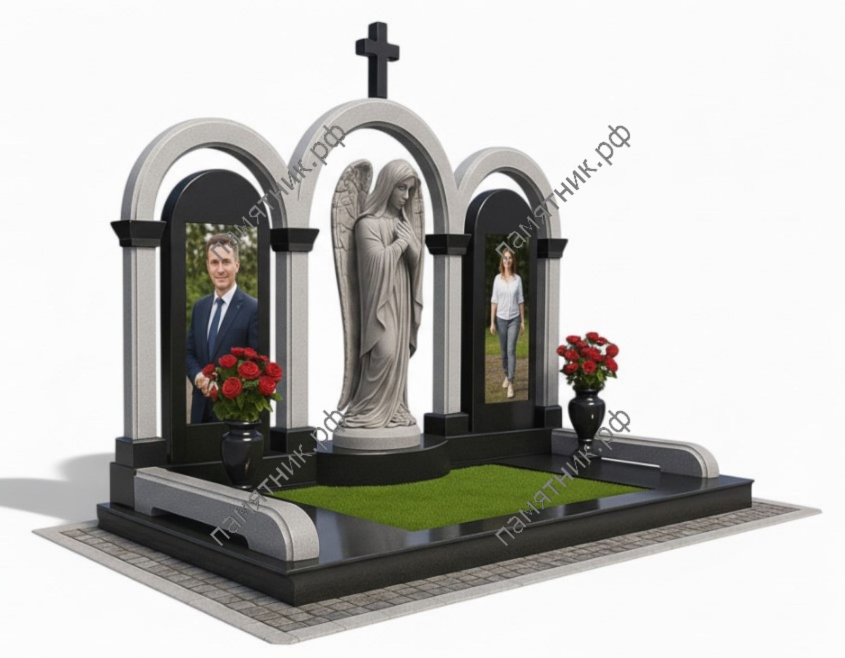 Мемориальный комплекс МК-142 — это масштабная архитектурная композиция с тройной аркой, построенная на контрасте темного и светлого камня. В центре располагается детализированная скульптура скорбящего ангела, а по бокам — две симметричные ниши для портретов. Композицию венчает строгий крест.
