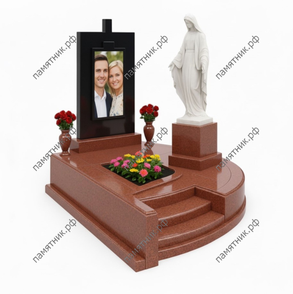 Мемориальный комплекс МК-145 — это торжественный мемориал с многоуровневым полукруглым подиумом и ступенями из красно-коричневого гранита. Рядом со строгой черной стелой, увенчанной крестом, на отдельном высоком постаменте установлена белоснежная скульптура Девы Марии.