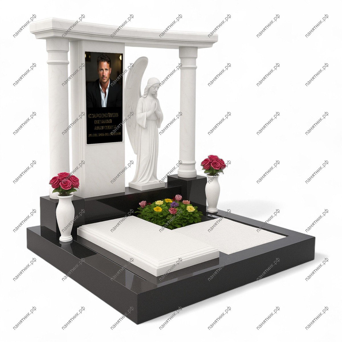 - Комплектация: Белый портик с колоннами, стела с контрастной вставкой, скульптура ангела, черный прямоугольный подиум, комбинированная надгробная плита с открытым цветником, вазоны.