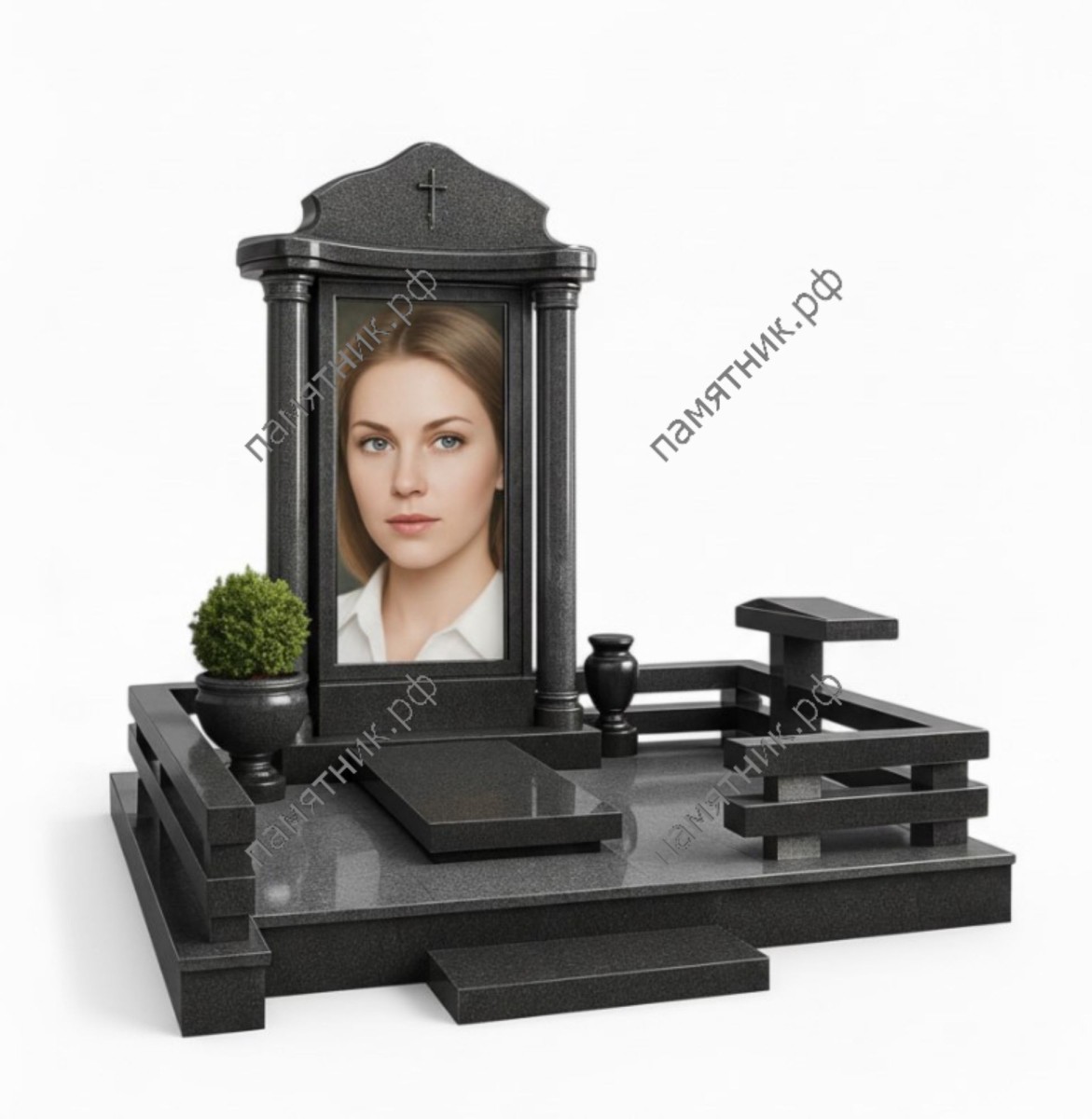 Мемориальный комплекс МК-163 — это солидное надгробие из темного гранита с архитектурными элементами. Портальная стела с колоннами и фигурным карнизом выделяет центральный портрет. Особенностью является оригинальная трехступенчатая ограда, переходящая в небольшую гранитную подставку-столик.