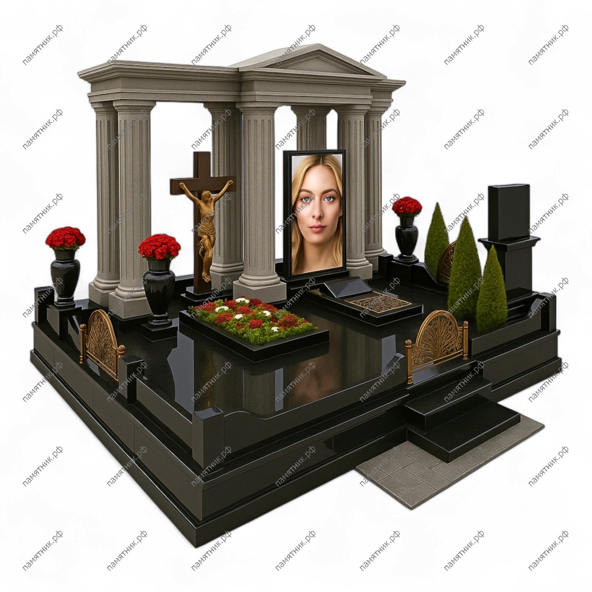 Мемориальный комплекс МК-17 — это масштабный и статусный архитектурный ансамбль. Величественная колоннада в античном стиле с фронтоном возвышается над просторным основанием из полированного черного гранита. Композицию дополняет выразительное объемное распятие.