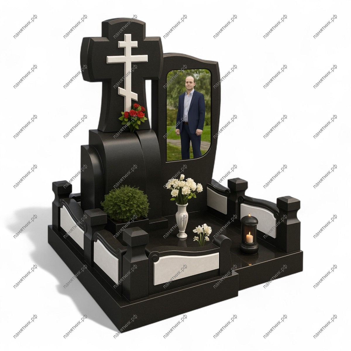 Мемориальный комплекс МК-174 выделяется массивными формами и выразительным религиозным символизмом. Левая часть стелы представляет собой крупный рельефный крест с белой вставкой, а правая — плавную панель для портрета. Ограда комплекса дополнена светлыми панелями, создающими эффектный контраст с черным камнем.