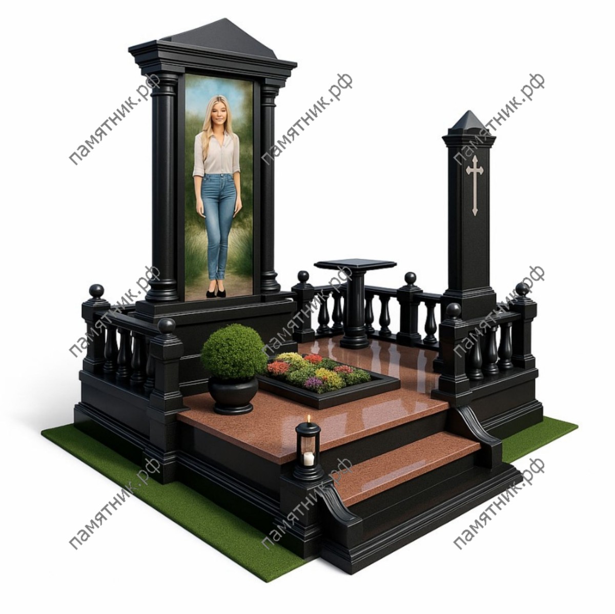 Мемориальный комплекс МК-184 — это строгий архитектурный ансамбль, построенный на контрасте черного и насыщенного красного гранита. Стела-портал с ростовым портретом и отдельная высокая колонна с крестом создают торжественную и защищенную атмосферу. Многоуровневое основание подчеркивает масштабность сооружения.