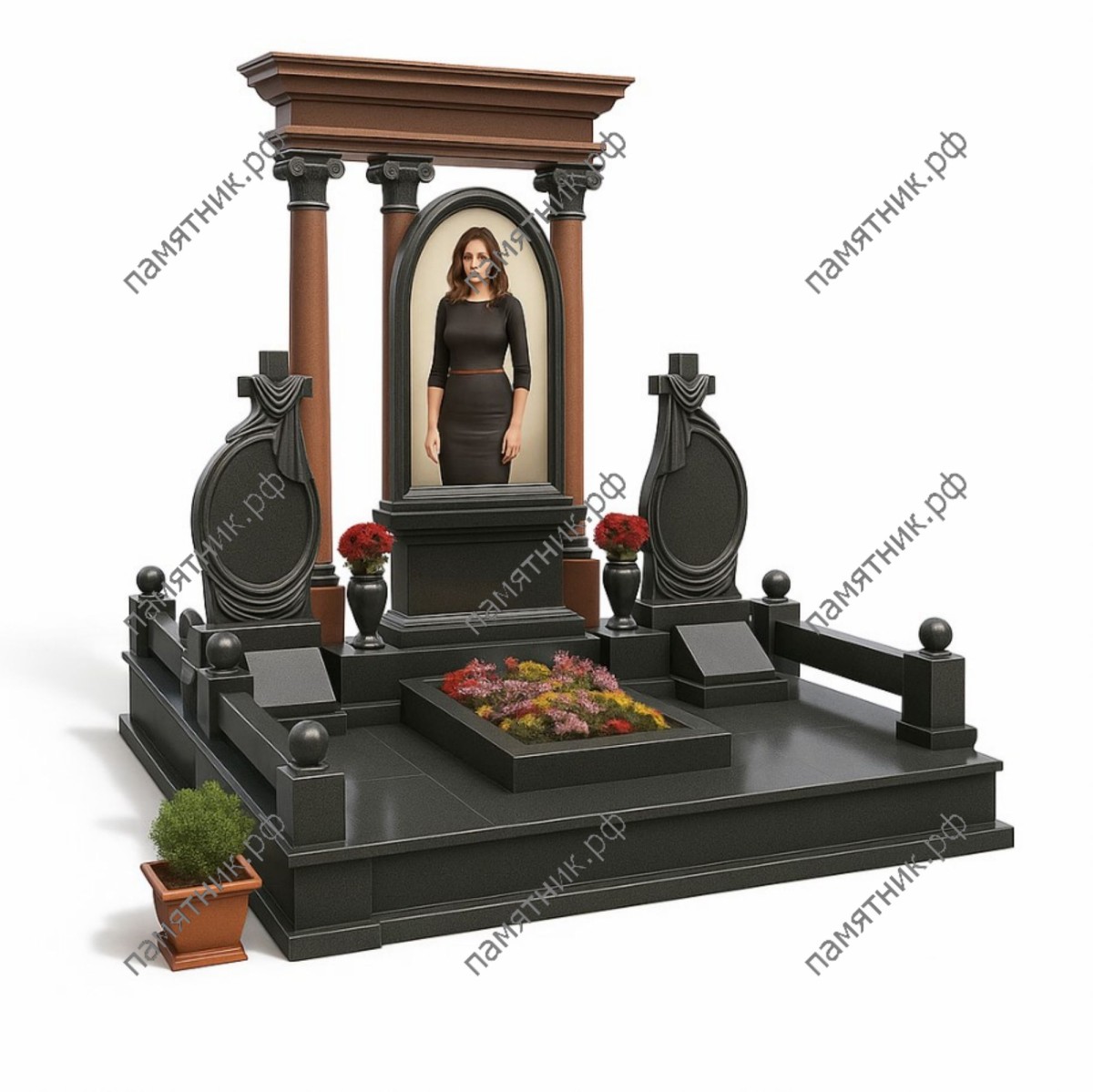 Мемориальный комплекс МК-190 — это масштабный проект для семейного захоронения, выполненный в благородном сочетании черного и коричневого камня. Центральный арочный портал с ростовым портретом дополнен двумя симметричными стелами с резными крестами и драпировкой. Высокий цоколь с шарами придает комплексу крепостную надежность.