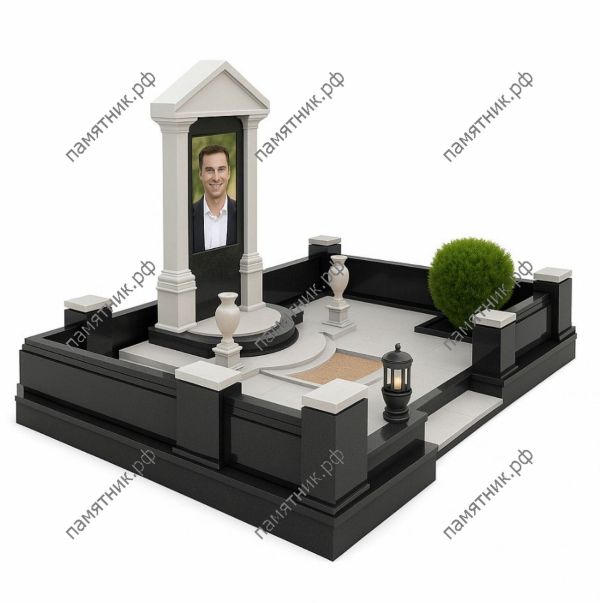 Мемориальный комплекс МК-203 представляет собой торжественный ансамбль, построенный на строгом контрасте белого и черного камня. Высокий белоснежный портал с колоннами и треугольным фронтоном выделяется на фоне темного цоколя. Массивная черная ограда надежно защищает внутреннее пространство, выложенное светлой плиткой.