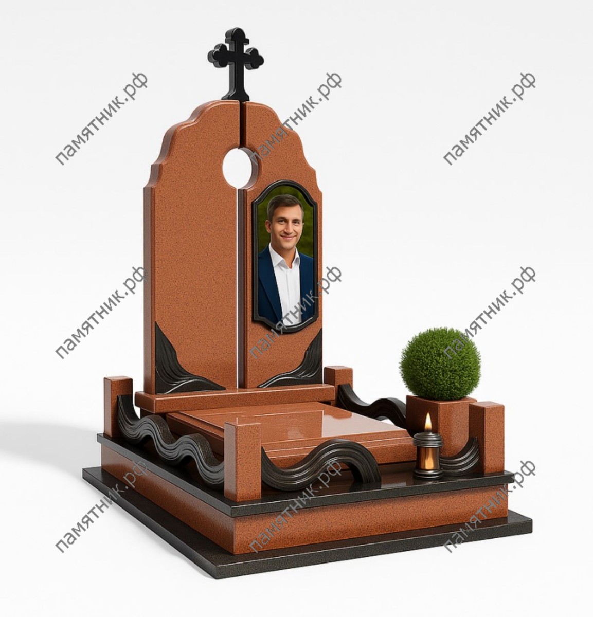 Мемориальный комплекс МК-207 выполнен из благородного красно-коричневого гранита с оригинальным декором. Стела состоит из двух вертикальных блоков с круглым отверстием в центре, которое венчает черный крест. Ограда украшена динамичными волнообразными вставками из черного камня, придающими комплексу уникальный вид.
