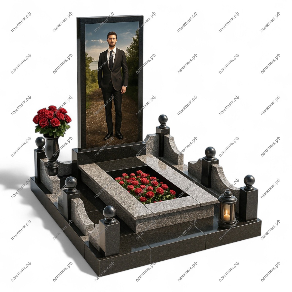 Мемориальный комплекс МК-211 — это строгое и современное решение, построенное на контрасте черного и серого гранита. Высокая прямоугольная стела предназначена для размещения полноростового портрета, что придает комплексу масштабность. Место захоронения выделено массивным двухцветным цоколем с аккуратными столбиками, увенчанными шарами.