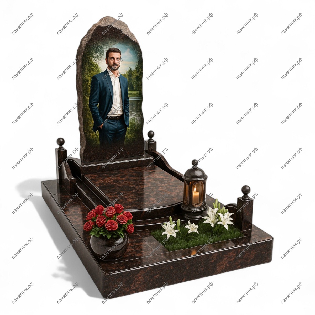 Мемориальный комплекс МК-216 выполнен в природном стиле из насыщенного коричневого гранита. Стела имитирует форму скалы с необработанными краями, внутри которой расположен цветной портрет на фоне лесного пейзажа. Массивная полированная ограда и выделенный цветник перед надгробием подчеркивают монументальность.