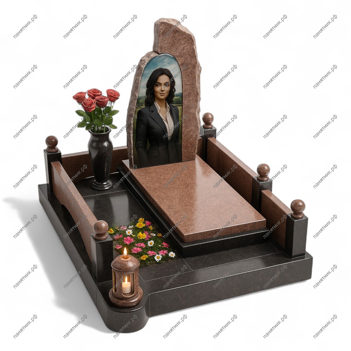 Мемориальный комплекс МК-225 сочетает в себе природную естественность и строгий классический стиль. Стела выполнена с эффектом «скалы» — её необработанные, грубые края контрастируют с идеально полированной центральной частью под портрет. Место захоронения обнесено аккуратной оградой с фигурными перекладинами и декоративными шарами.