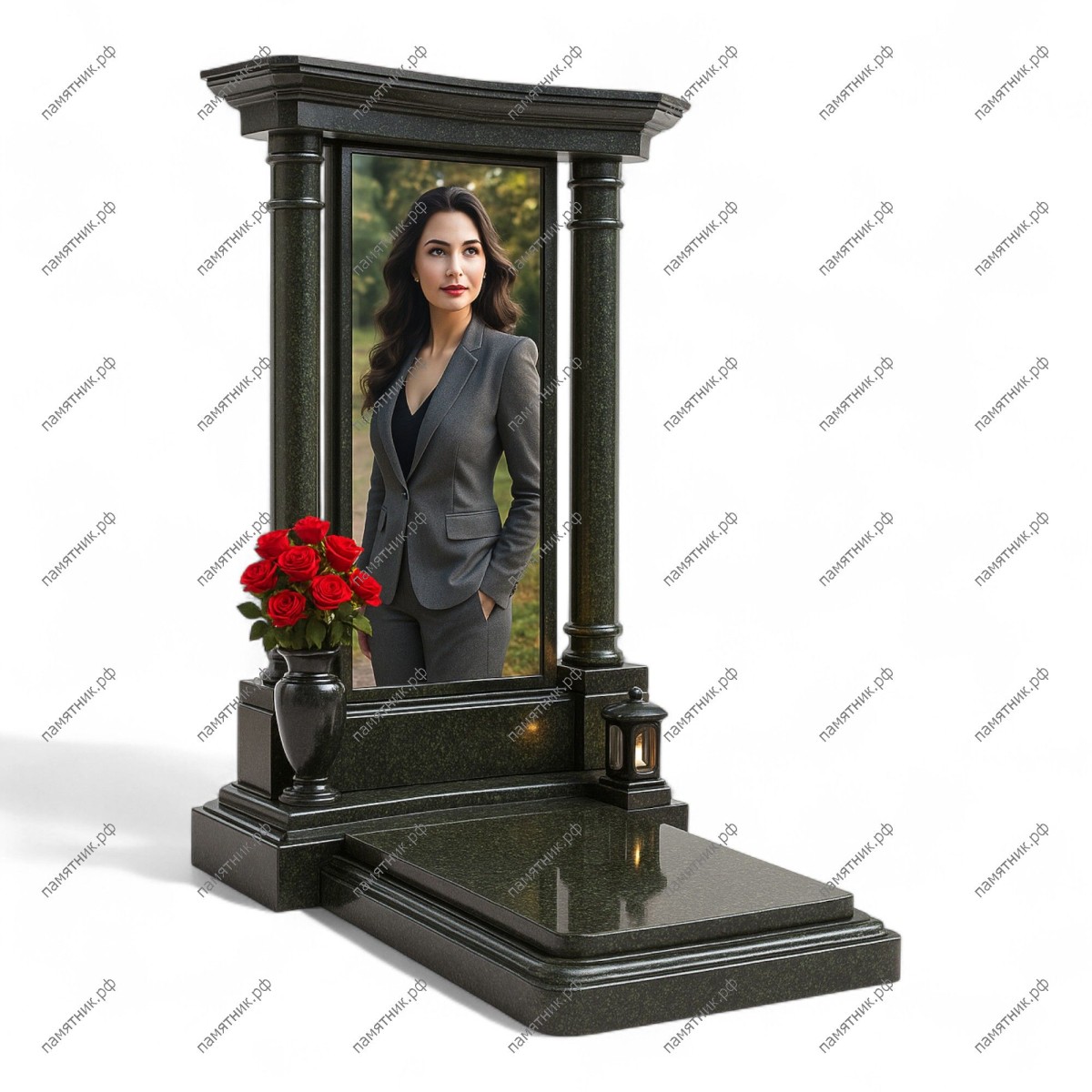Мемориальный комплекс МК-229 — это строгий монумент в виде высокого классического портала. Две массивные колонны с капителями поддерживают тяжелый карниз, акцентируя внимание на ростовом портрете. Глубокий темный оттенок камня и отсутствие лишнего декора подчеркивают торжественность и значимость мемориала.