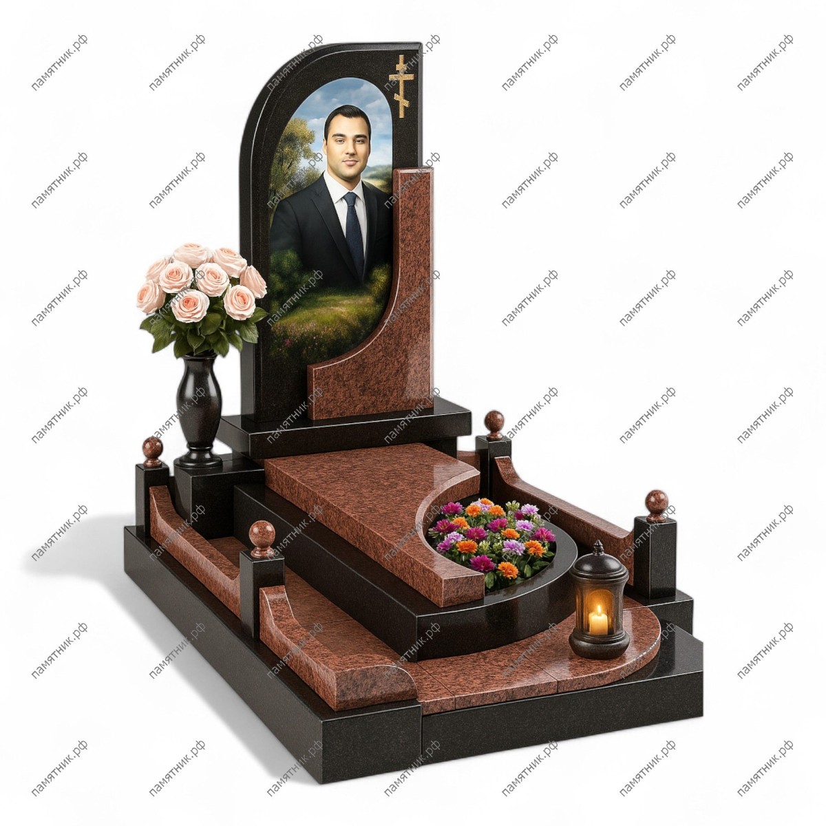 Мемориальный комплекс МК-230 представляет собой сложную художественную композицию с использованием религиозных символов. Асимметричная двухцветная стела украшена накладным золотистым крестом и имеет плавный вырез, переходящий в линию надгробия. Ограждение с невысокими столбиками и волнообразными перекладинами завершает гармоничный образ.