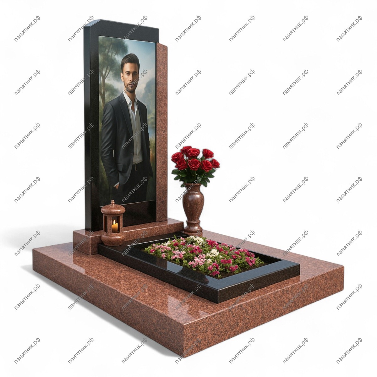 Мемориальный комплекс МК-235 отличается монументальностью и четкостью линий. Основная стела из черного гранита дополнена боковой колонной из красно-коричневого камня. Широкое красное основание служит надежным фундаментом для черного прямоугольного цветника.