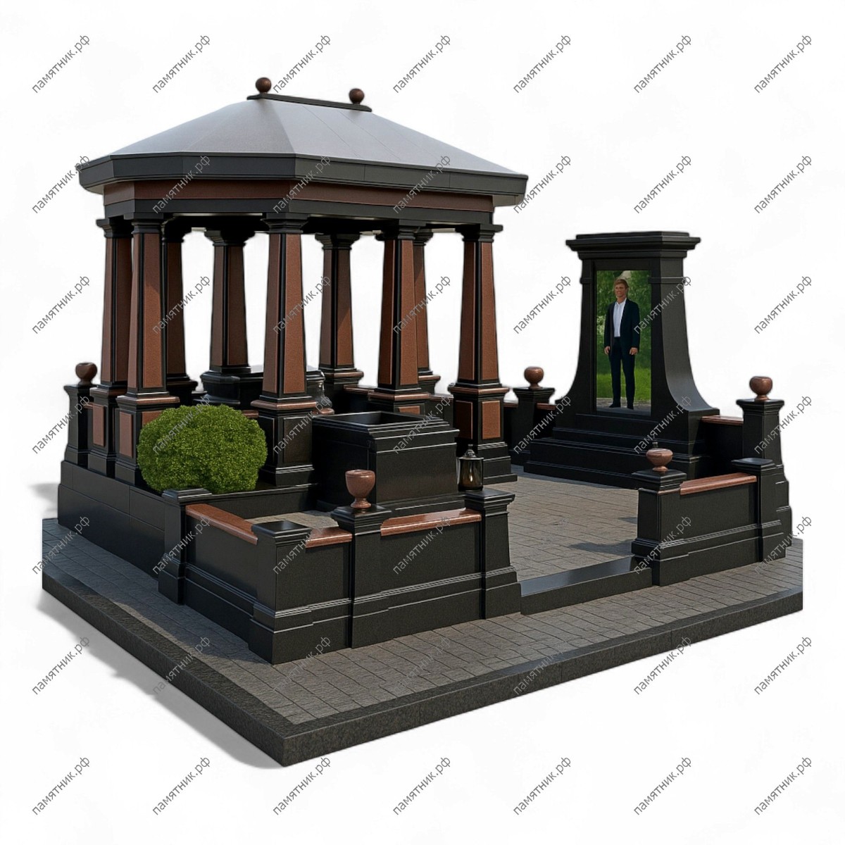 Мемориальный комплекс МК-24 — это монументальное сооружение в виде массивной крытой часовни-беседки. Сочетание черного и красно-коричневого гранита придает комплексу статусность и солидность. Массивная крыша, опирающаяся на колонны, надежно защищает место захоронения.