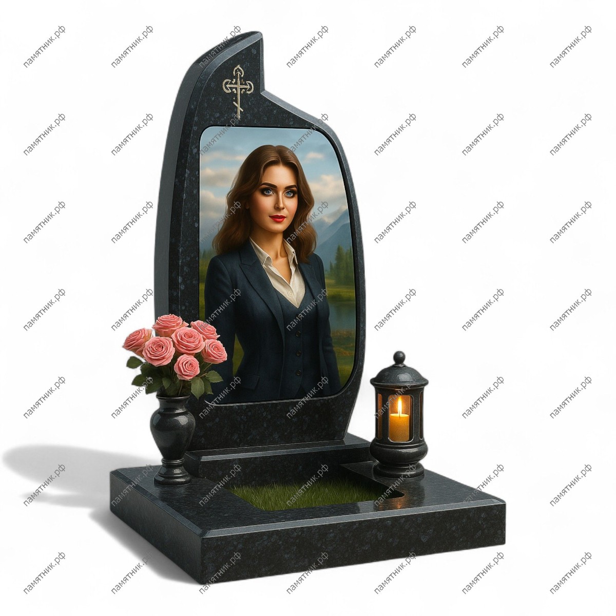 Мемориальный комплекс МК-261 — элегантная композиция из темно-синего гранита с характерными светлыми вкраплениями. Стела имеет изящный асимметричный силуэт с плавным изгибом верхней грани, украшенной лаконичной гравировкой креста. Центральное место занимает широкоформатный портрет на стекле, гармонично вписанный в обвод памятника.