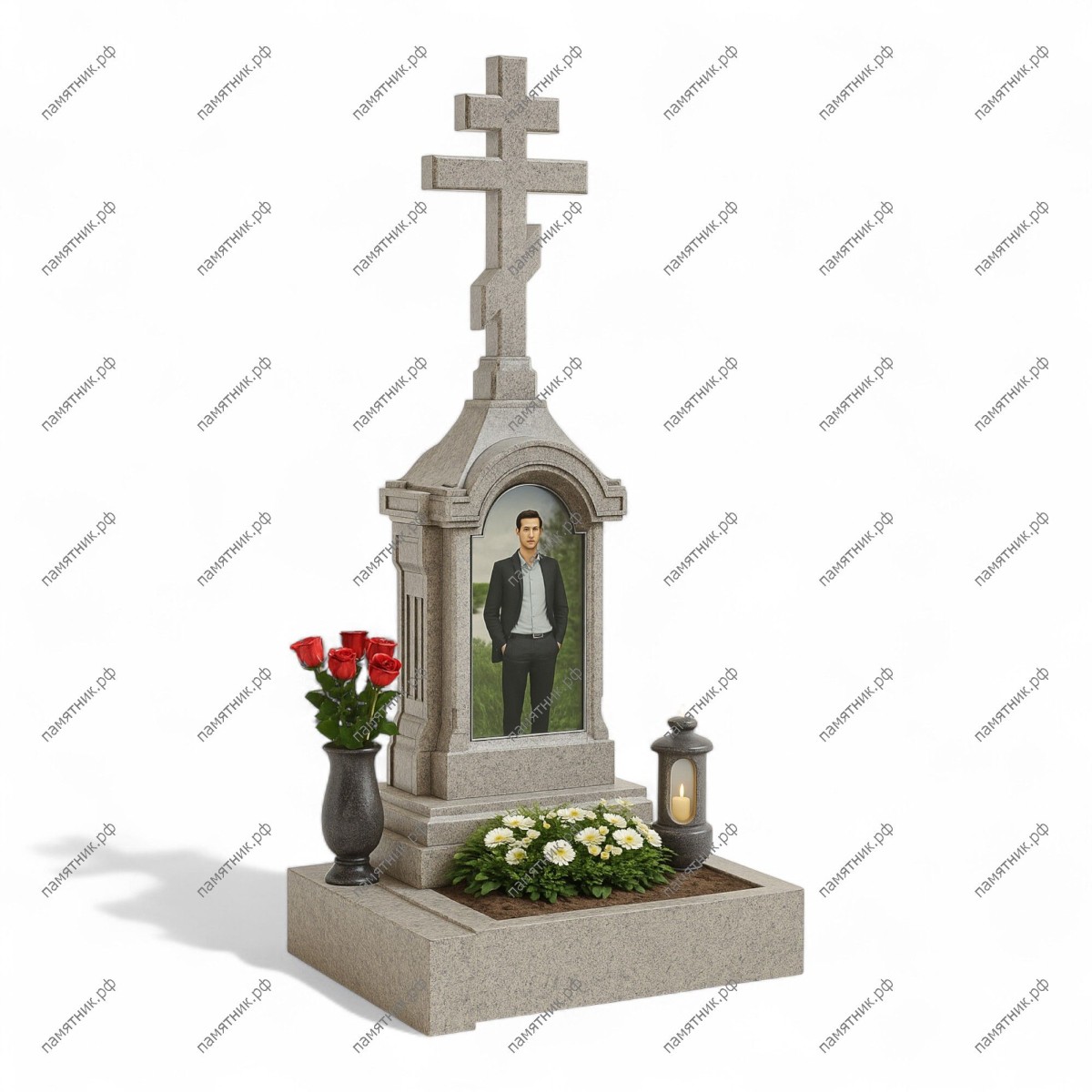 Мемориальный комплекс МК-262 выполнен в монументальном архитектурном стиле из светло-серого мелкозернистого гранита. Конструкция напоминает портал часовни: арочная ниша для портрета увенчана массивным восьмиконечным православным крестом. Строгие формы и классическая резьба подчеркивают торжественность монумента.