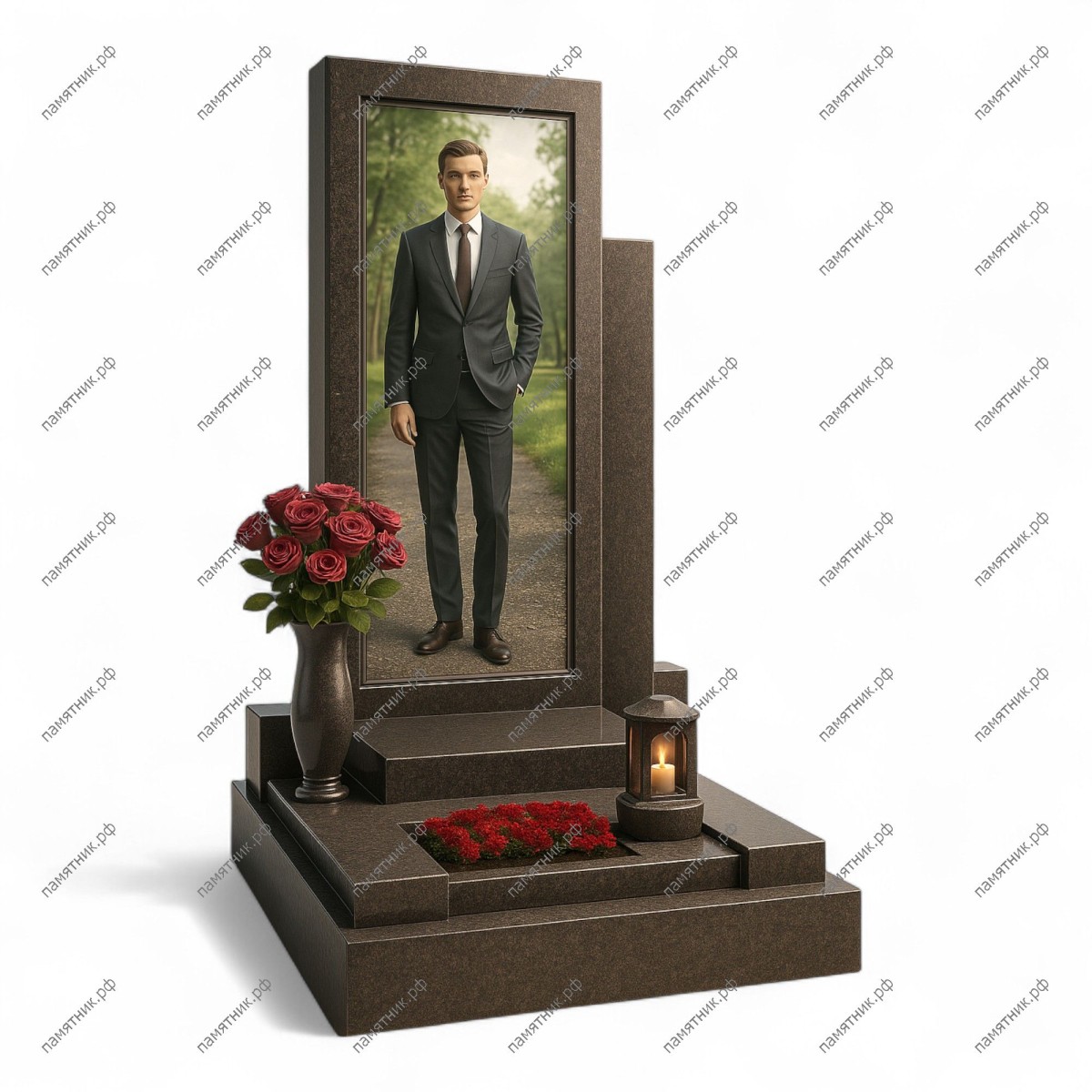 Мемориальный комплекс МК-268 выполнен в стиле современного минимализма из темного гранита. Композиция состоит из двух прямоугольных вертикальных блоков разной высоты, создающих строгий асимметричный силуэт. Массивное ступенчатое основание подчеркивает основательность и долговечность памятника.